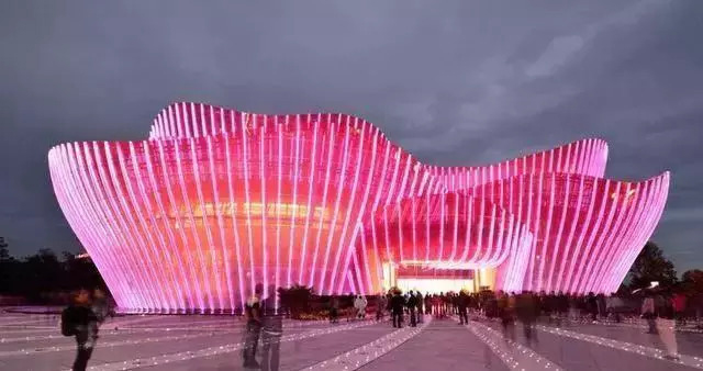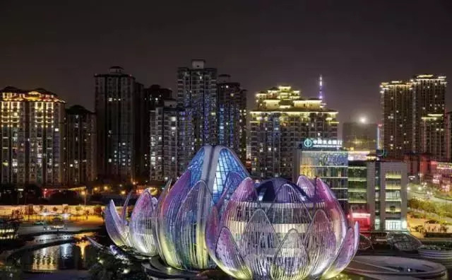 与常州武进莲花馆一样,都江堰的“芙蓉花”也是以花的外形作为建筑造型。这座“芙蓉花”耗资1.5亿,有8000块彩釉玻璃,每一块玻璃都能跟真花一样实现整体渐变,整个建筑极其逼真生动,其工艺和品质都达到世界级的水平