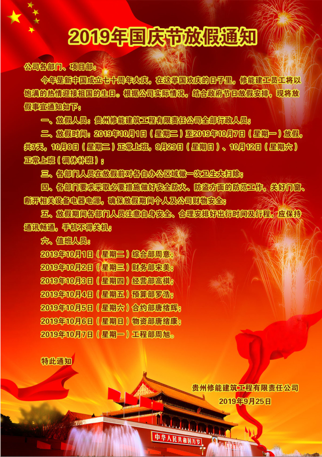 2019年国庆节放假通知