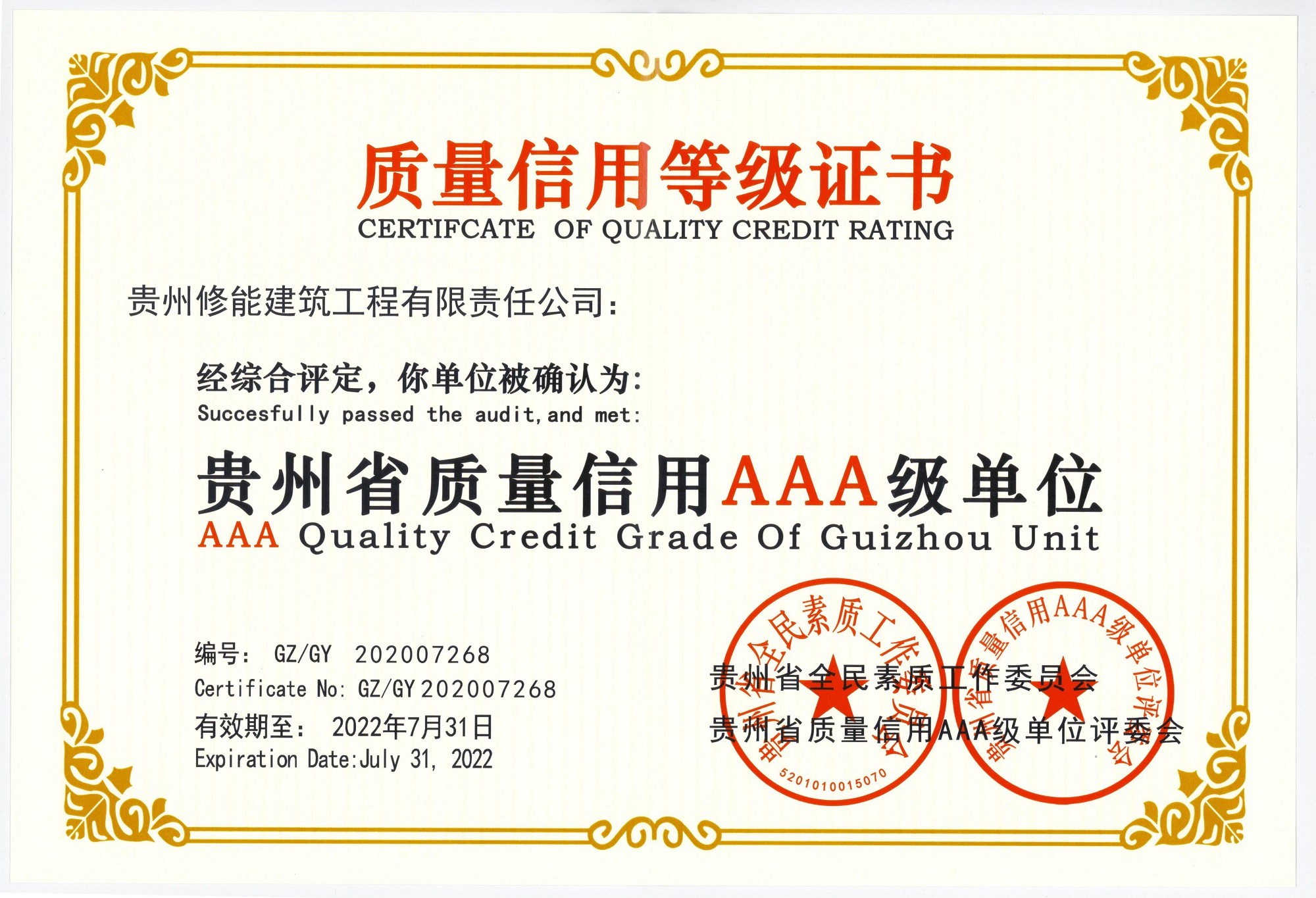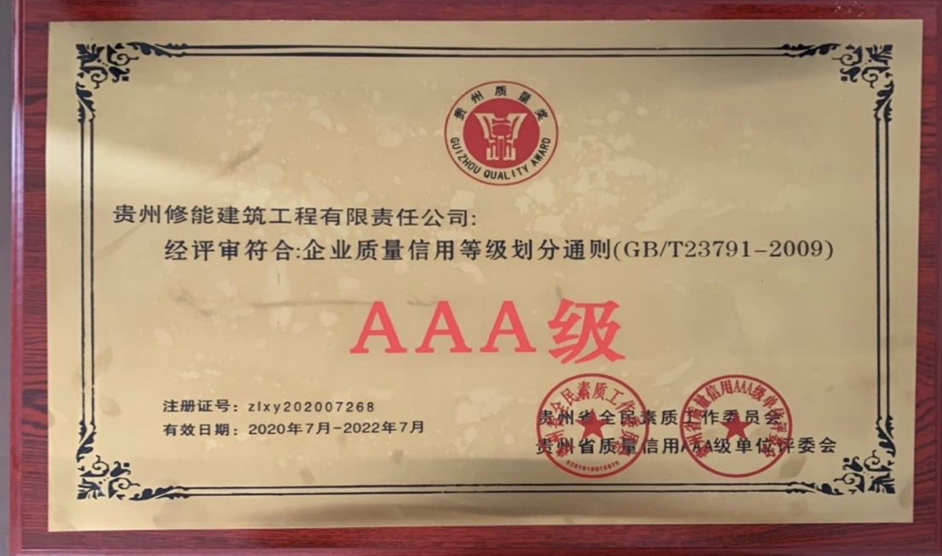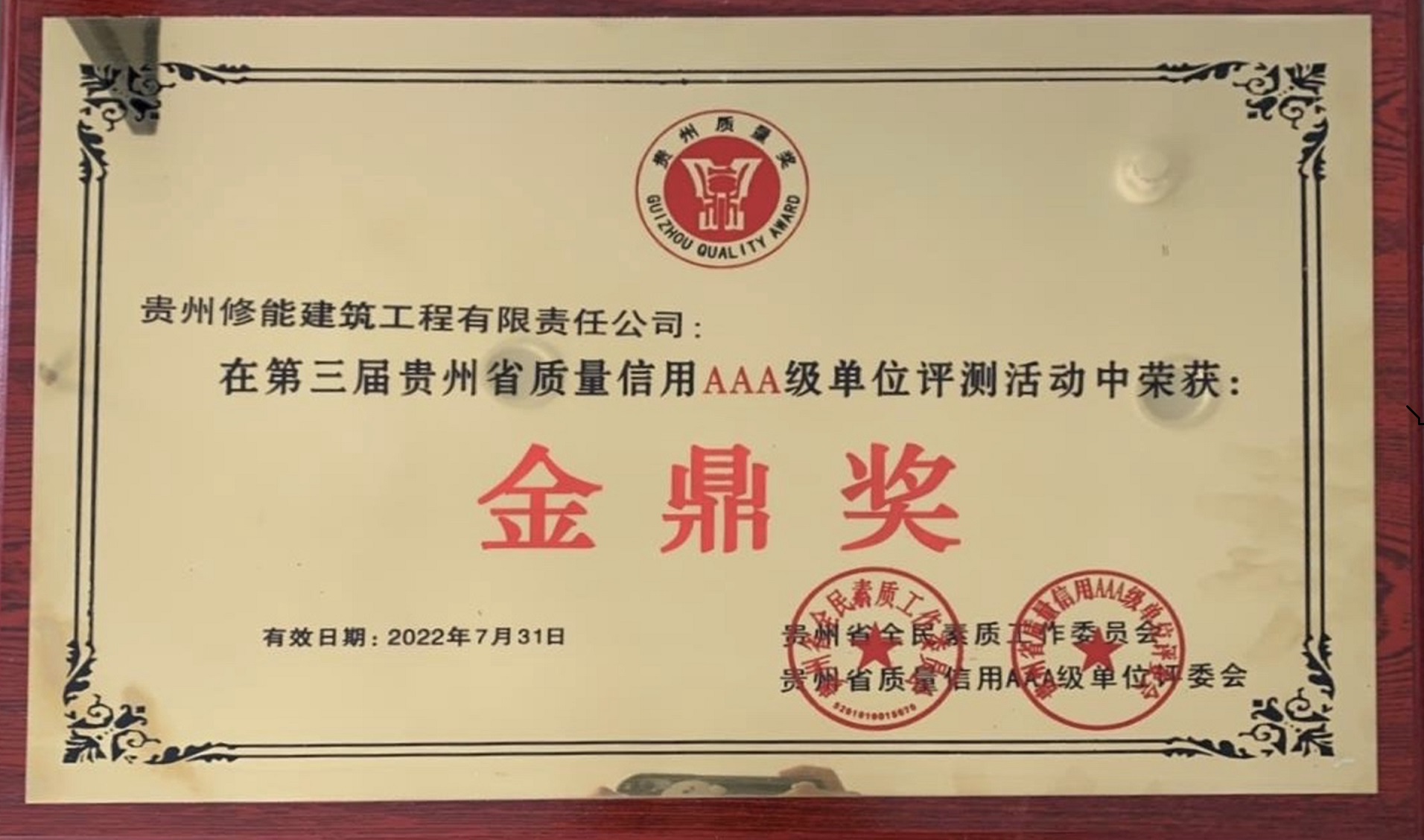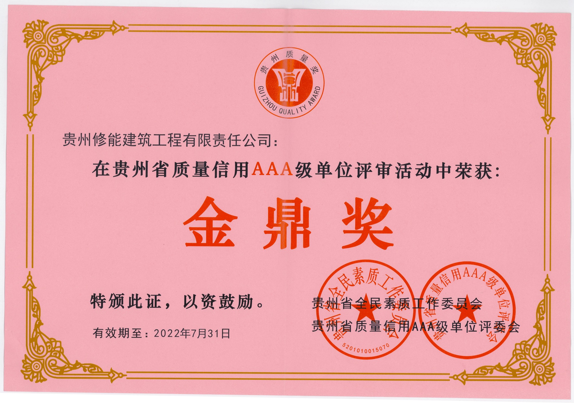 我司于2020年3月25日开始报名参加评选活动,2020年8月10日荣获贵州省全民素质工作委员会主办的第三届贵州省质量信用AAA级单位和金鼎奖荣誉。